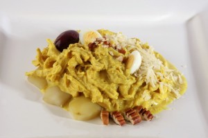 Creamy, spicy, with the pungency of the Parmesan cheese and the delicate texture of the pecans, Aji de Gallina means hen´s chili.