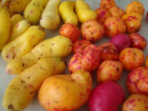 Ollucos look like bright colorful potatoes but they are something quite different. These Andean tubers have a somewhat slimy and
