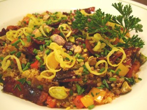 COLORFUL AND NUTRIENT-PACKED QUINOA PILAF WITH PEPPERS, BACON AND PISTACHIOS. Today is Latina Cook-Off day, and this recipe was created
